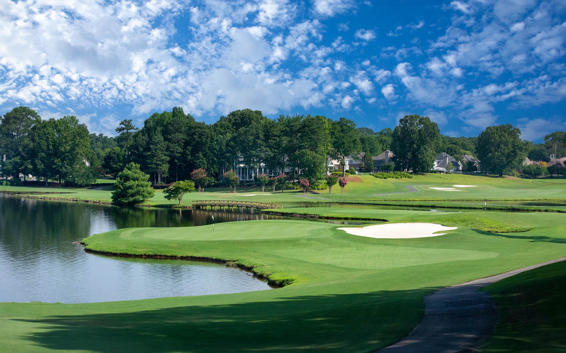 Downhill dogleg right with a welcoming view of the back nine lake holes. The downhill approach takes flight to a large forgiving green.